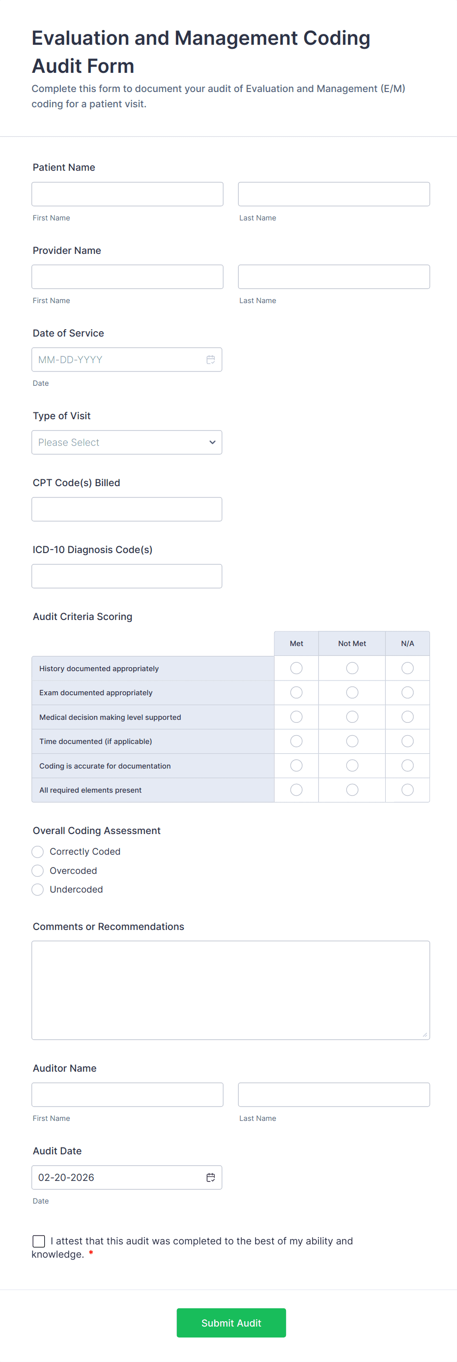 Audit forms are specialized tools designed to systematically evaluate, inspect, or review processes, operations, compliance, or assets within an organization. These forms are commonly used in industries such as finance, healthcare, manufacturing, education, and hospitality to ensure adherence to standards, identify areas for improvement, and document findings. Audit forms can cover a wide range of scenarios, including safety inspections, quality control checks, compliance audits, internal process reviews, and facility assessments. By providing a structured format for data collection, audit forms help organizations maintain accountability, track corrective actions, and support continuous improvement initiatives.