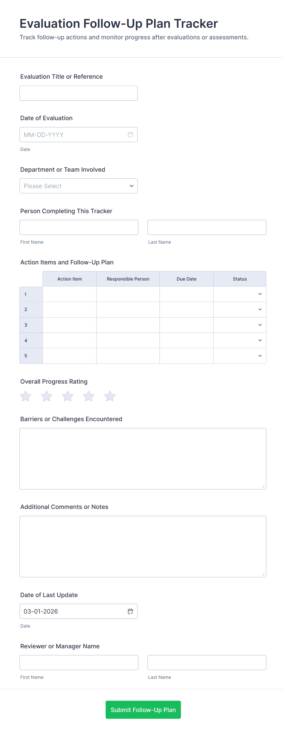 A tracking form is a digital tool used to record, monitor, and manage specific types of data over time, such as inventory levels, attendance, expenses, or project progress.
