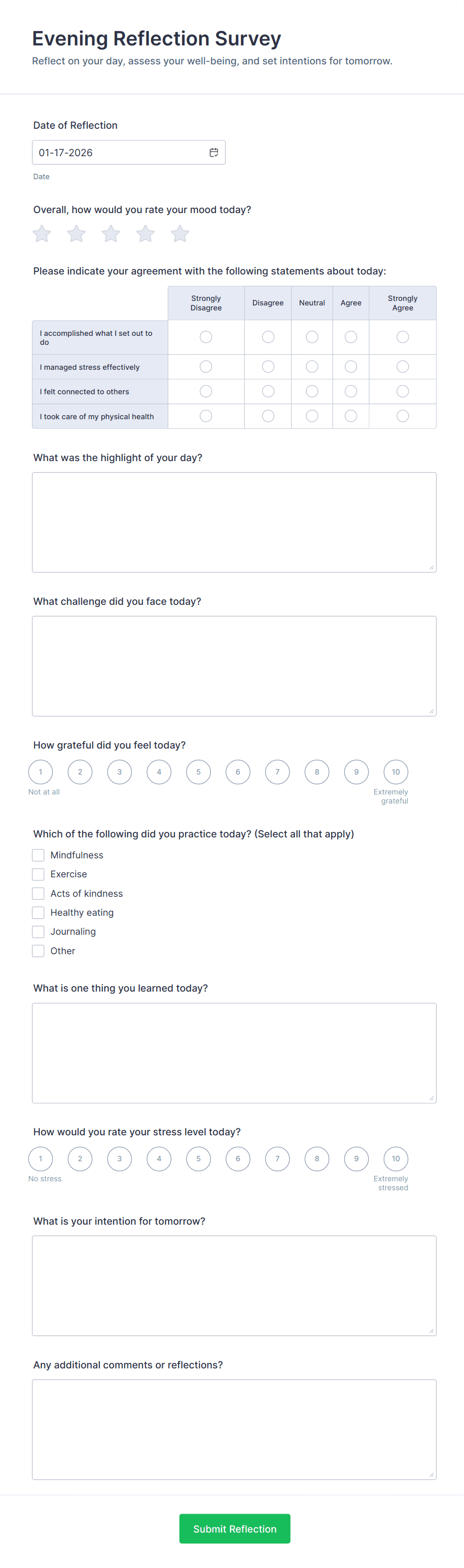A wellness form is a digital questionnaire or survey used to collect information about an individual’s health, lifestyle habits, and well-being. It can be used for assessments, daily check-ins, progress tracking, and more.