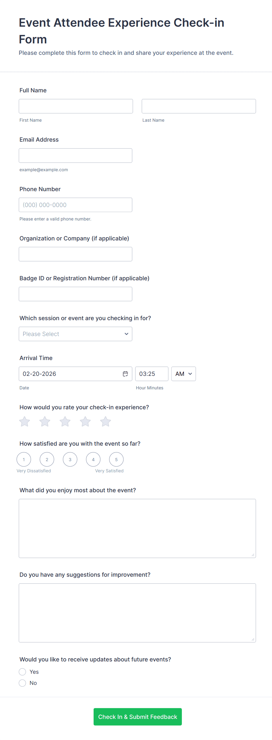 - Event Check-In: May include fields for ticket number, session selection, and special requirements.