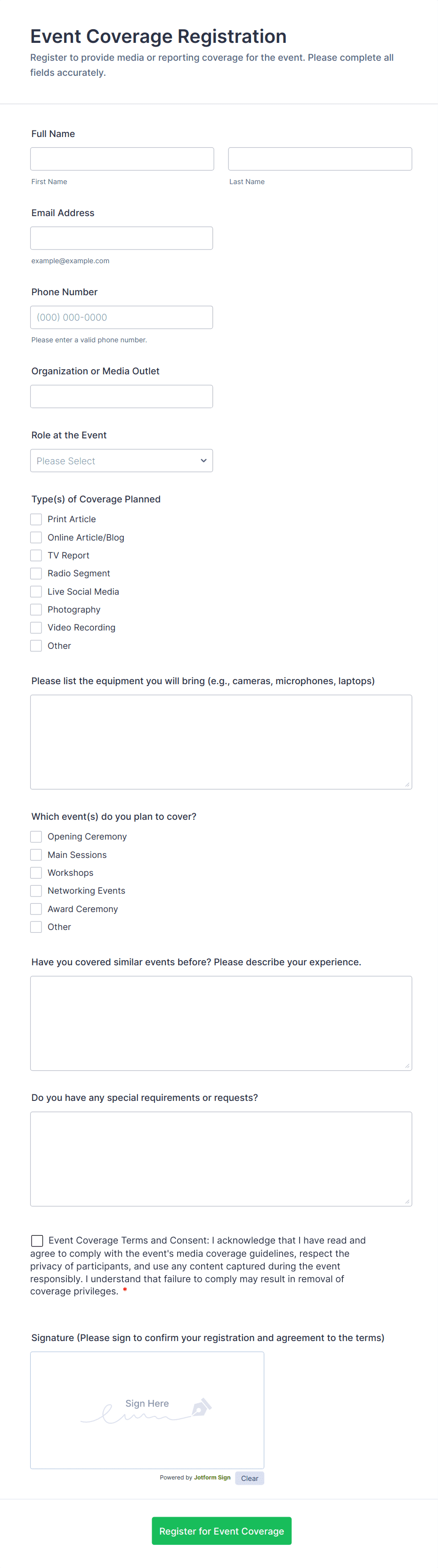Event Registration Forms are digital tools designed to streamline the process of collecting attendee information for a wide variety of events, such as conferences, workshops, webinars, fundraisers, classes, and social gatherings. These forms allow organizers to gather essential details like participant names, contact information, payment preferences, dietary restrictions, and session selections. By using event registration forms, event planners can efficiently manage RSVPs, track attendance, and ensure a smooth check-in process on the day of the event. The flexibility of these forms makes them suitable for both small private gatherings and large-scale public events, adapting to the unique requirements of each occasion.