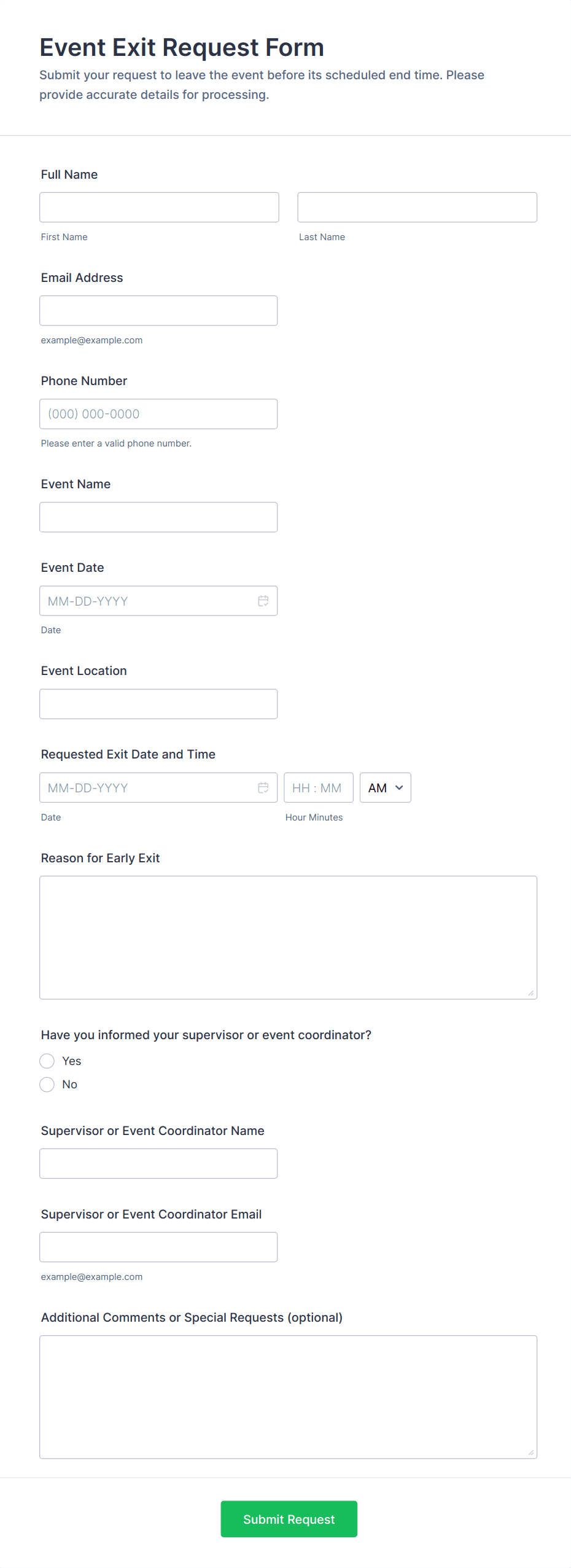 • Internal event request forms focus on event purpose, preferred dates, headcount, budget range, and approval requirements.