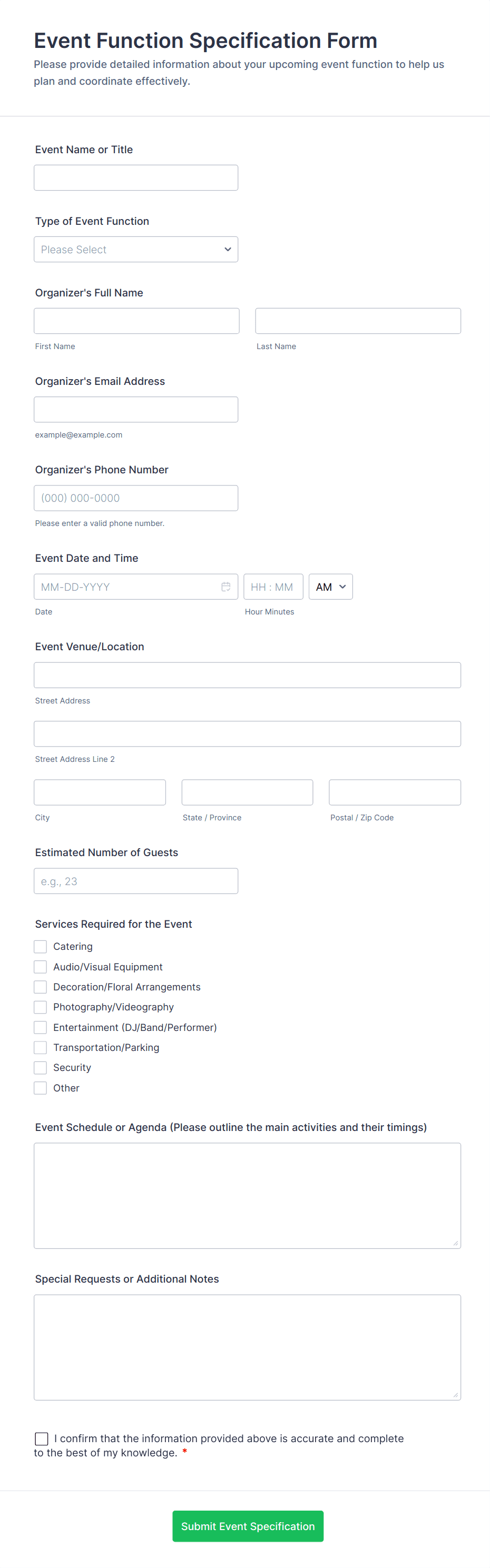 Include location preferences, room setup, catering, AV, staffing, and any vendor details. Add file uploads for agendas or quotes.