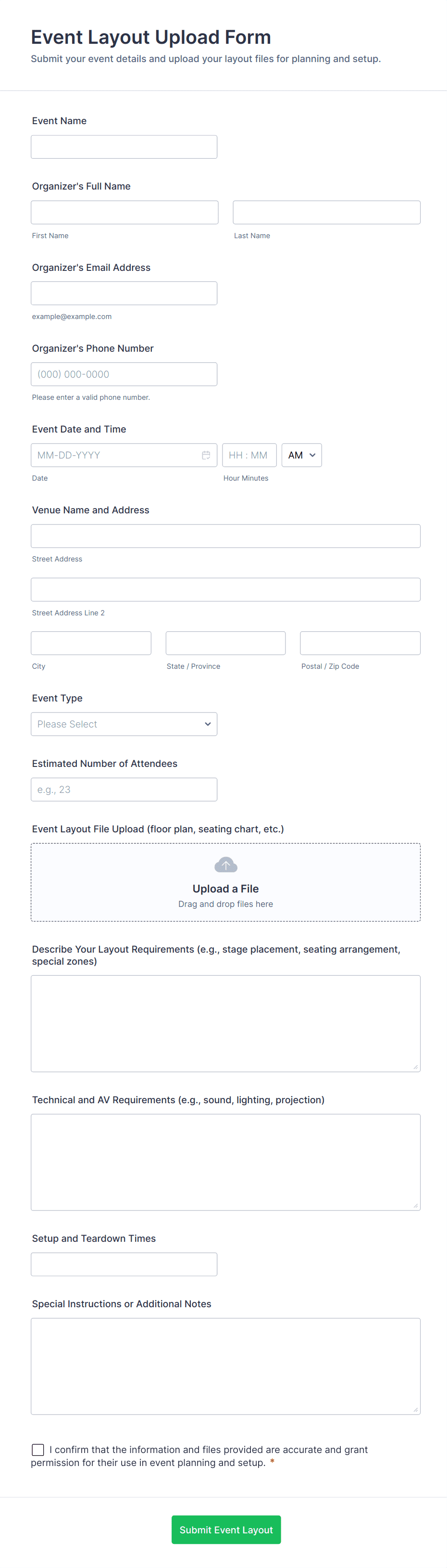 File Upload Forms are specialized online forms designed to collect files, documents, images, or other digital assets directly from users. These forms are commonly used in scenarios where individuals or organizations need to gather supporting materials, such as job applications with resumes, event registrations with ID proofs, homework submissions, design requests, or client onboarding documents. The versatility of File Upload Forms makes them essential for businesses, educational institutions, creative agencies, HR departments, and service providers who require a secure and efficient way to receive files from clients, students, or collaborators.