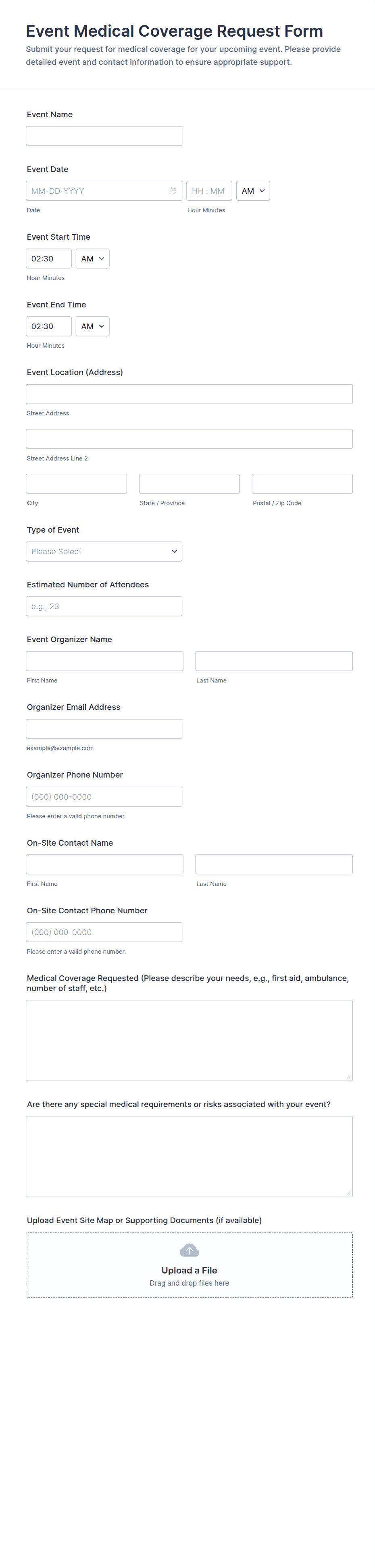 Include location preferences, room setup, catering, AV, staffing, and any vendor details. Add file uploads for agendas or quotes.