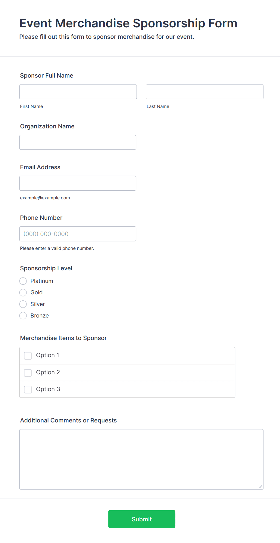 A sponsorship form is a document or online form used to collect information and commitments from individuals or organizations willing to support an event, project, or cause financially or through in-kind contributions.