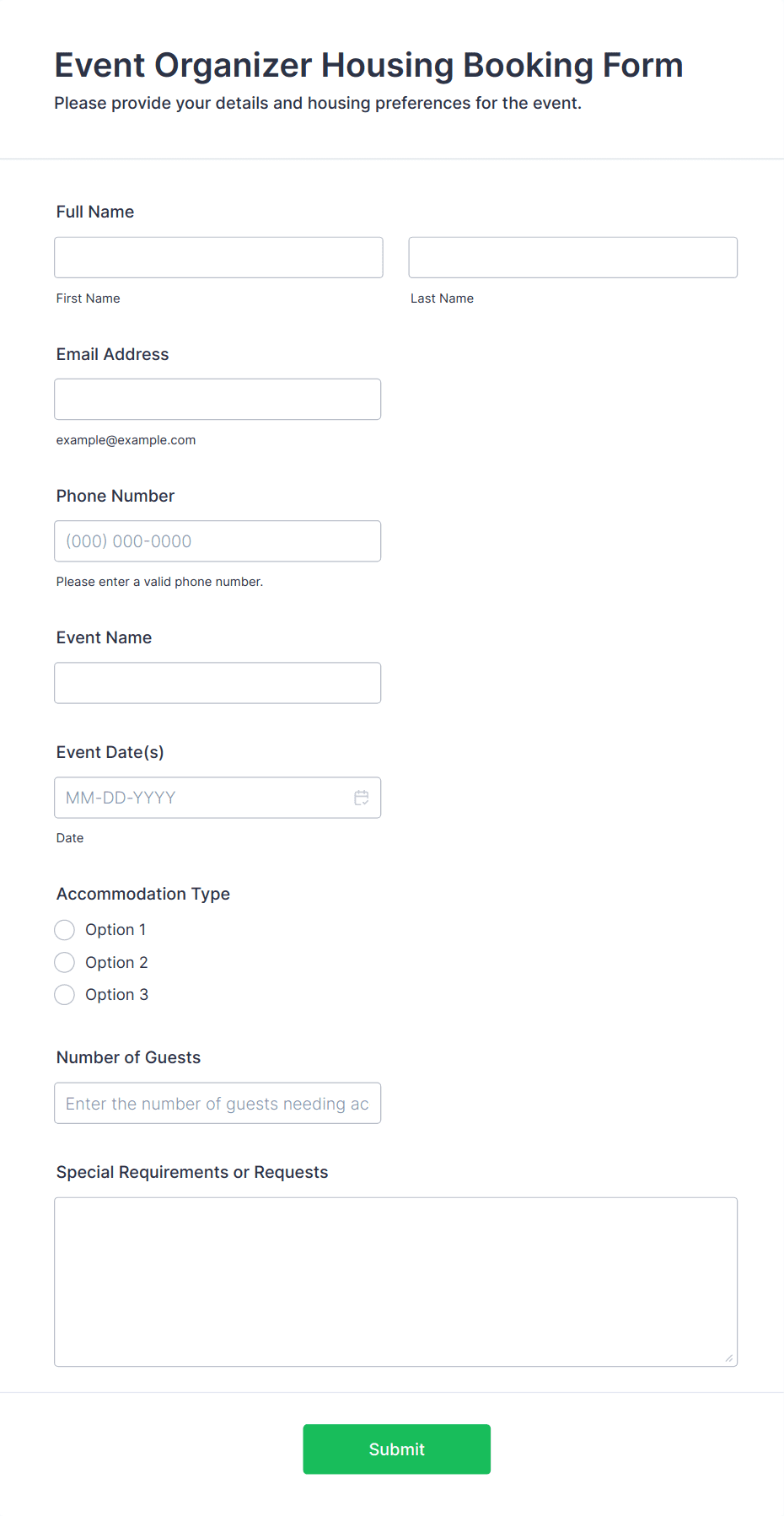 • Content and Fields: A concert booking form may require seat selection and payment integration, while a workshop sign-up might focus on participant details and session preferences. Private event RSVPs may include meal choices or guest information, whereas facility reservations could need date/time selectors and equipment checklists.