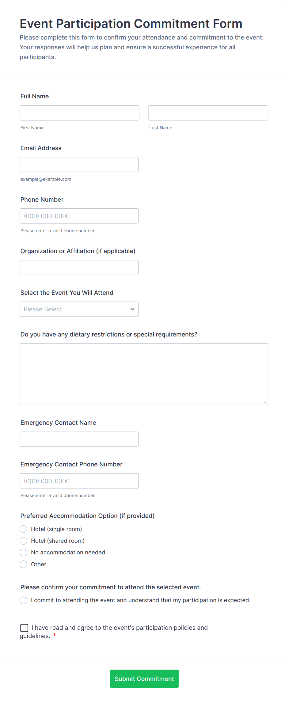 RSVP forms are digital tools designed to collect responses from invitees regarding their attendance at events, gatherings, meetings, or special occasions. Whether you’re organizing a wedding, corporate seminar, birthday party, or community event, RSVP forms streamline the process of confirming guest participation, gathering essential details like meal preferences, plus-ones, or special requirements. These forms help event organizers efficiently manage headcounts, plan logistics, and ensure a smooth experience for both hosts and attendees. The versatility of RSVP forms means they can be tailored for formal galas, casual get-togethers, virtual webinars, or even recurring club meetings.