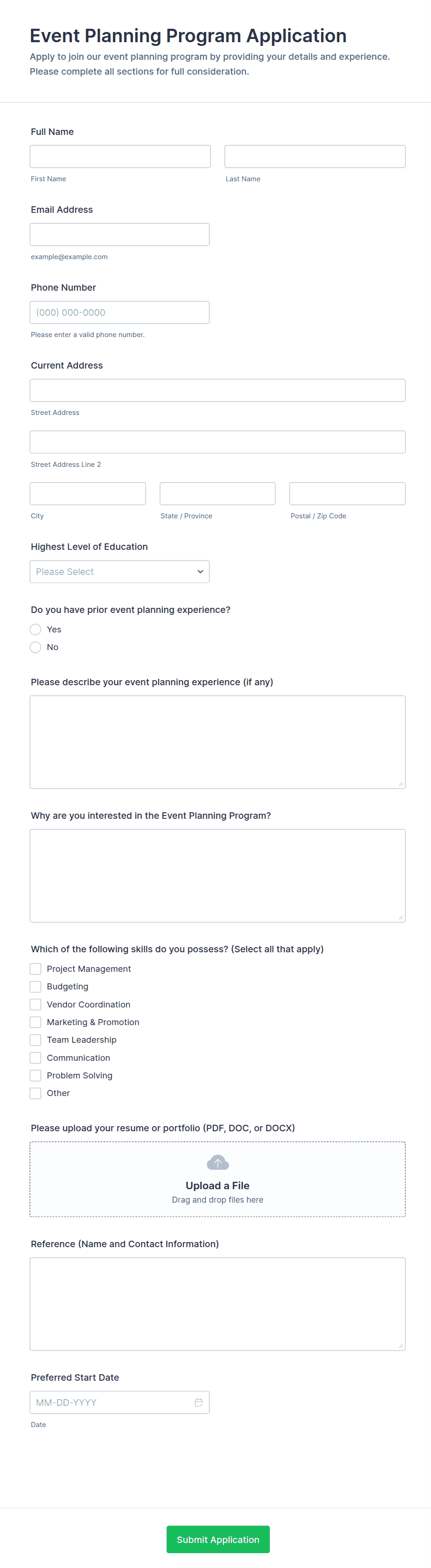• For job applications, include fields for personal information, education, work experience, references, and file uploads for resumes or cover letters.