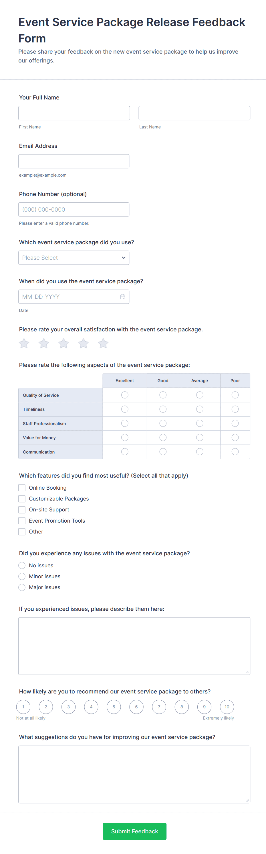 • Content and fields may vary based on event type; for example, a conference feedback form might include session ratings, while a social event form may focus on food, entertainment, and atmosphere.