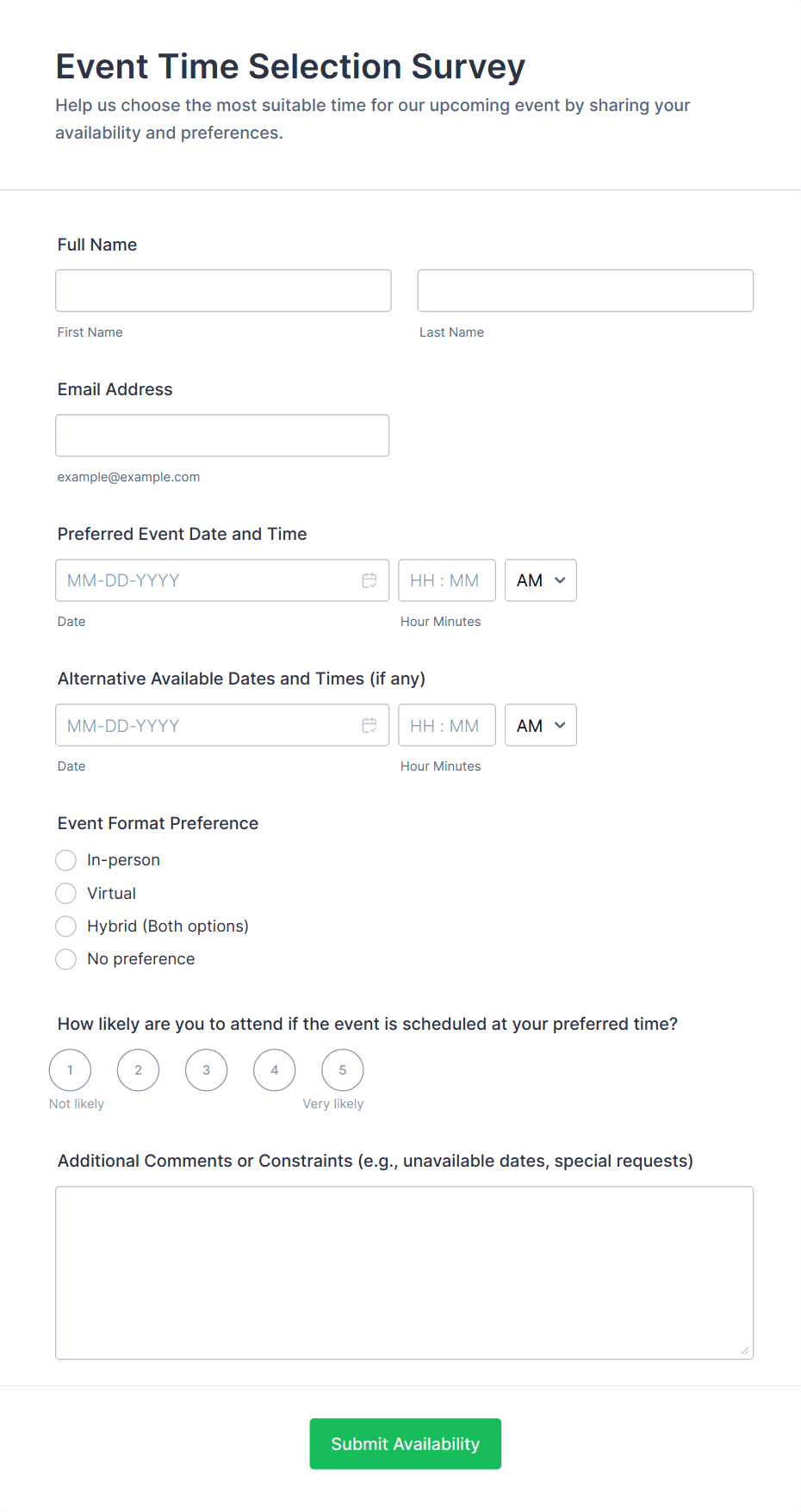 • For virtual events, include questions about technology, accessibility, and online engagement.