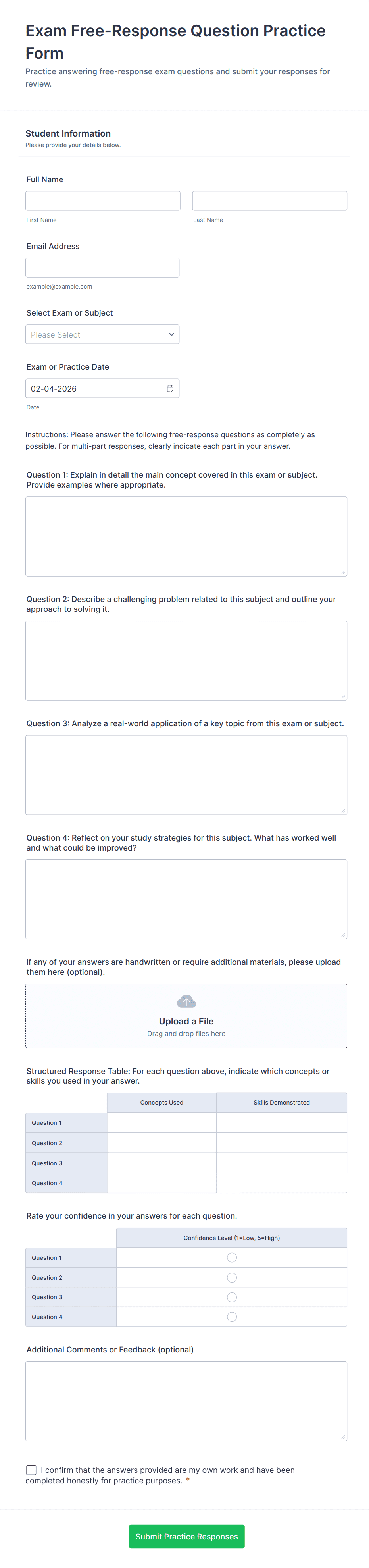 Exam forms usually collect student identification details, answers to various question types (multiple choice, short answer, essays), and sometimes consent or honor code acknowledgments.