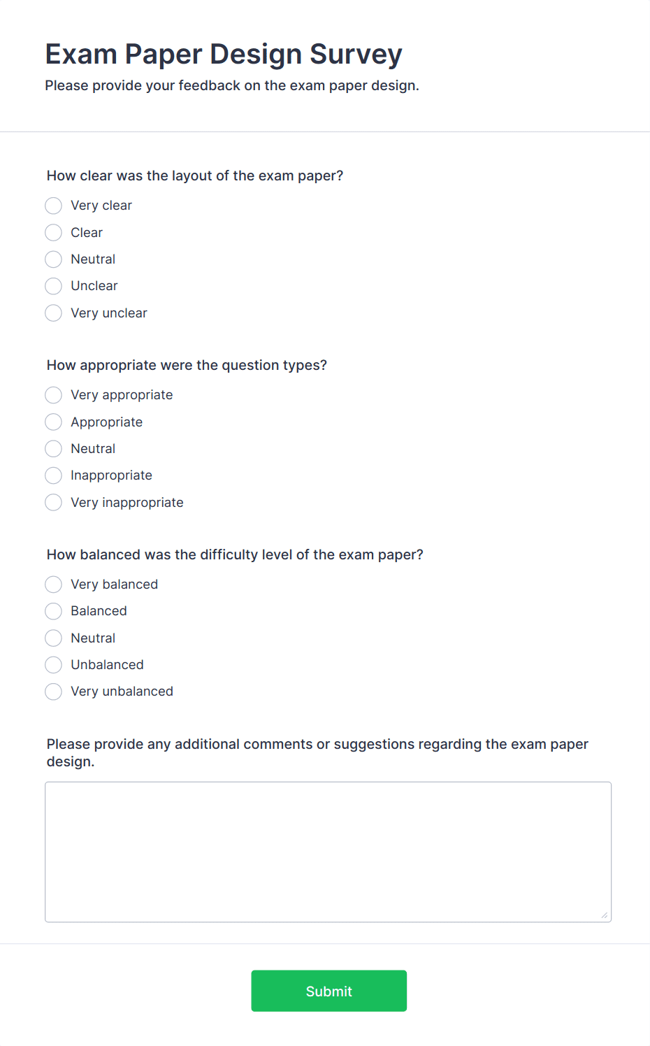 Survey templates are pre-designed forms that help individuals and organizations collect feedback, opinions, or data from a target audience. These templates are widely used for a variety of purposes, such as customer satisfaction surveys, employee engagement assessments, market research, event feedback, and academic studies. By providing a structured set of questions, survey templates streamline the process of gathering valuable insights, making it easier to analyze trends, measure satisfaction, and make informed decisions. Whether you’re a business owner, HR professional, educator, or researcher, survey templates offer a quick and effective way to reach your audience and collect actionable information.