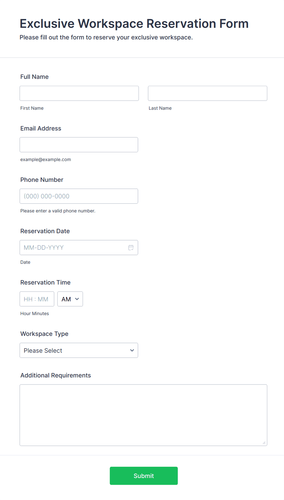 Booking forms are digital tools designed to streamline the process of scheduling appointments, reserving services, or booking resources. They are commonly used across a variety of industries, including hospitality, healthcare, education, event management, and personal services. Whether you’re managing hotel room reservations, client appointments, event registrations, or equipment rentals, booking forms help automate the intake of essential information, reduce manual errors, and ensure a smooth experience for both service providers and customers. Typical use cases include booking consultations, reserving meeting rooms, scheduling classes, or securing tickets for events.