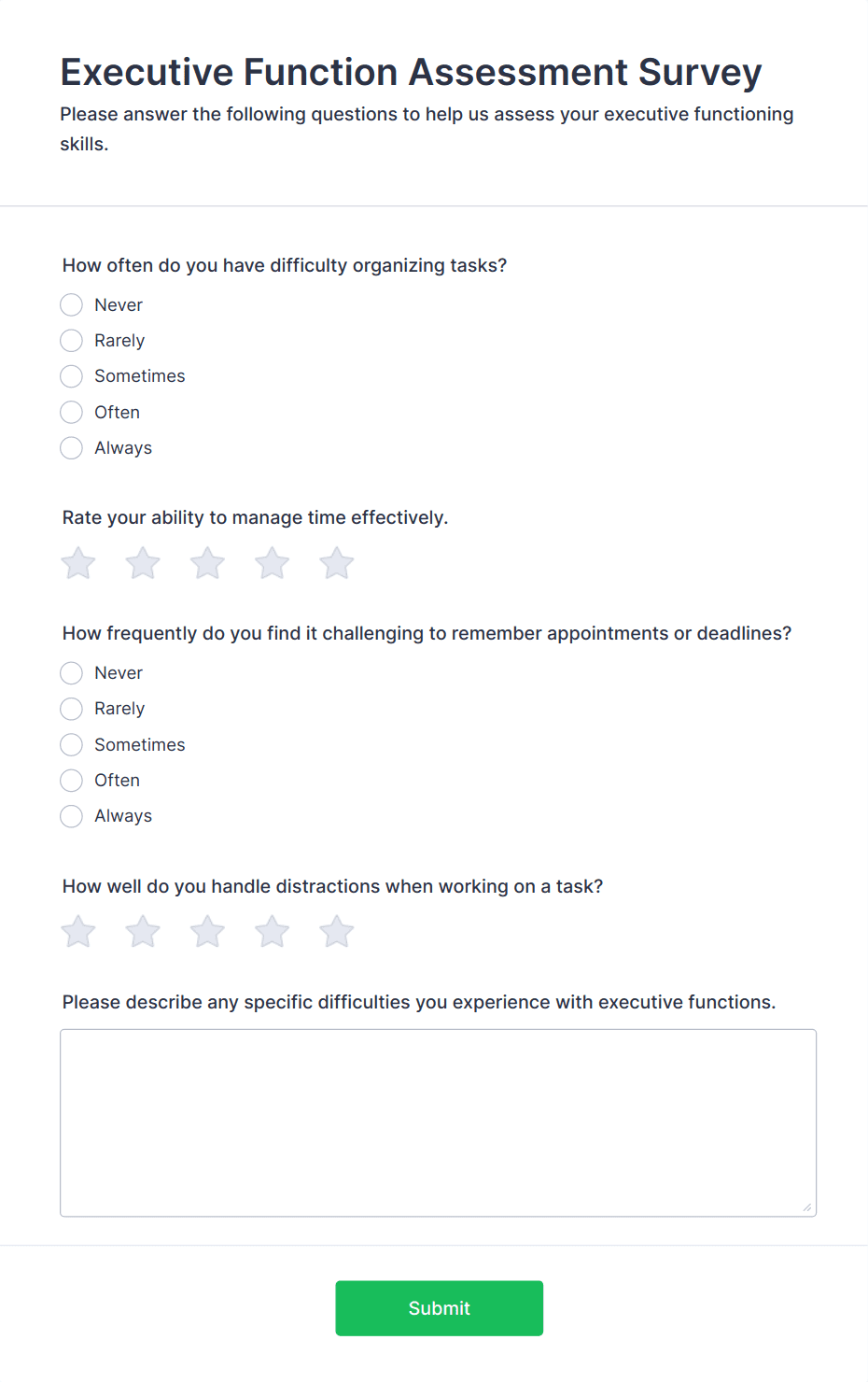 With Jotform, users can easily access and customize a wide selection of Assessment Form Templates to fit their unique needs. Leveraging Jotform’s intuitive drag-and-drop Form Builder, users can add or modify questions, integrate scoring logic, and personalize the design to match their branding—all without any coding. Jotform’s platform also supports advanced features such as conditional logic, automated notifications, and seamless data management, ensuring that assessments are not only easy to create but also efficient to distribute and analyze. Whether you’re an educator, HR professional, or healthcare provider, Jotform’s Assessment Form Templates streamline the evaluation process and help you collect reliable data with ease.
