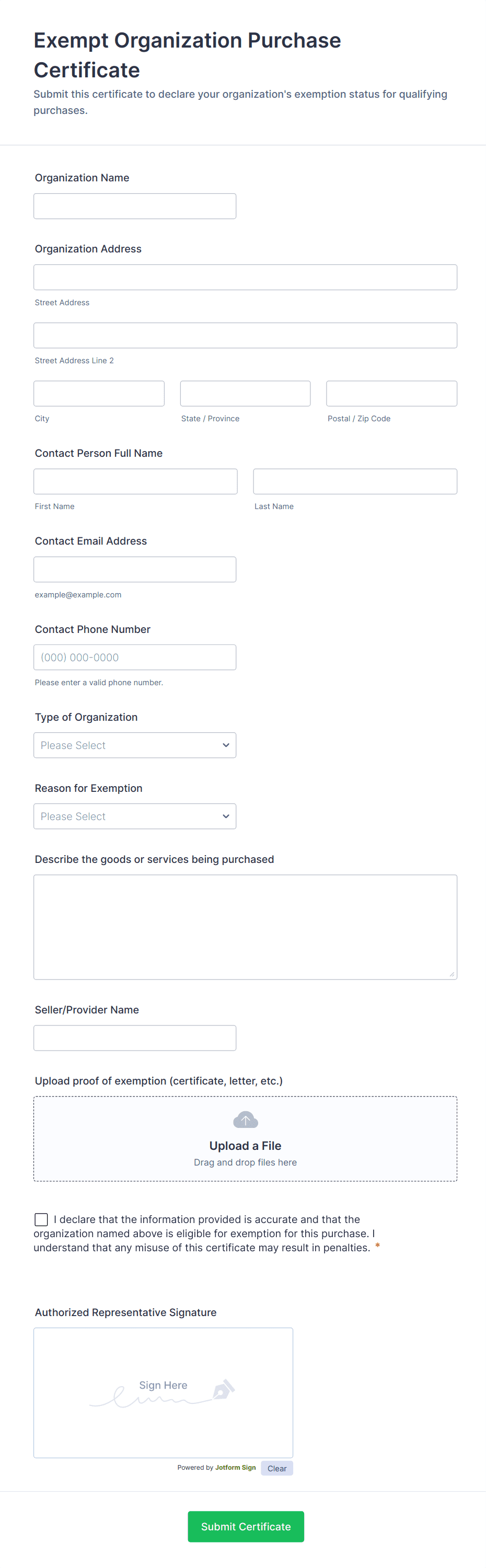 Whether you’re a government agency collecting official tax forms or an accountant gathering information from your clients, securely receive tax information online with Jotform’s Tax Forms! Start by selecting a form template below and customizing it to match your needs and branding. Then share the form or embed it in your website to be filled out on any smartphone, tablet, or computer. Submissions are stored in your secure Jotform account and can be converted into professional PDF documents automatically.