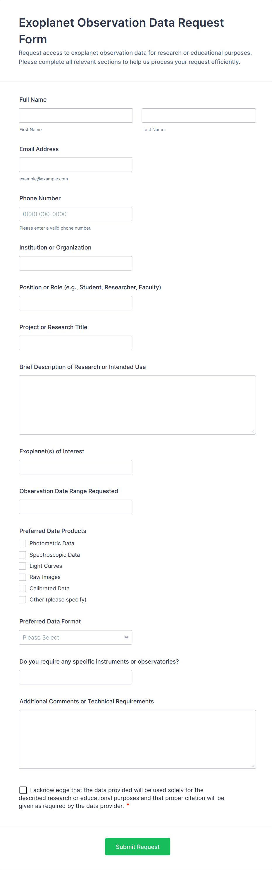 • Content and Fields: The fields included in the form will differ based on the use case. For example, a customer inquiry form may require contact details and a description of the issue, while a research data request form might need institutional affiliation and project details.