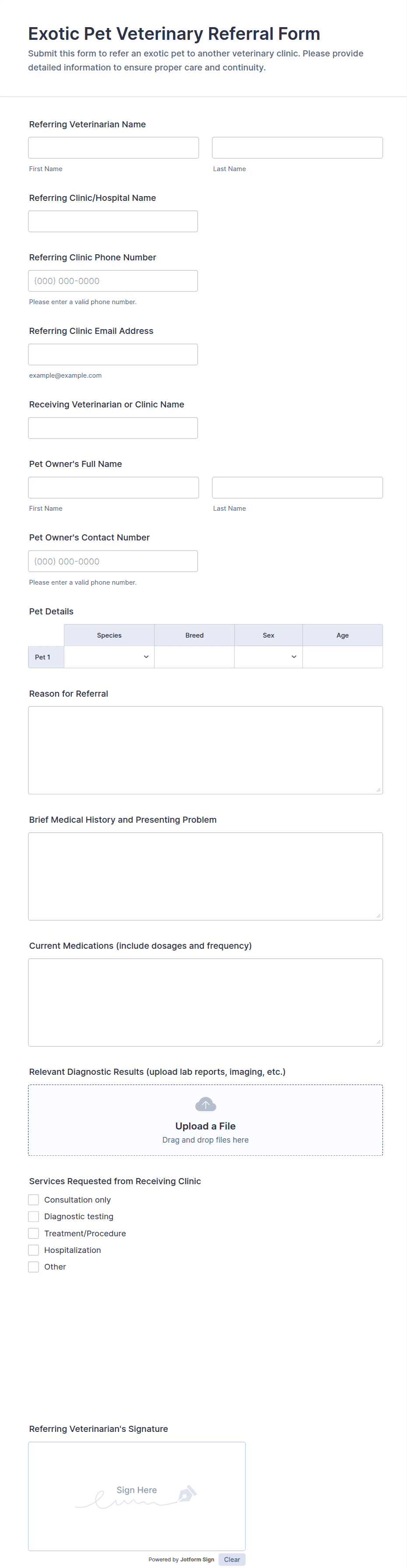 A Veterinary Referral Form is a form template designed to facilitate the process of referring a patient from a primary veterinarian to a specialist or another veterinary clinic for further evaluation, diagnosis, or treatment.