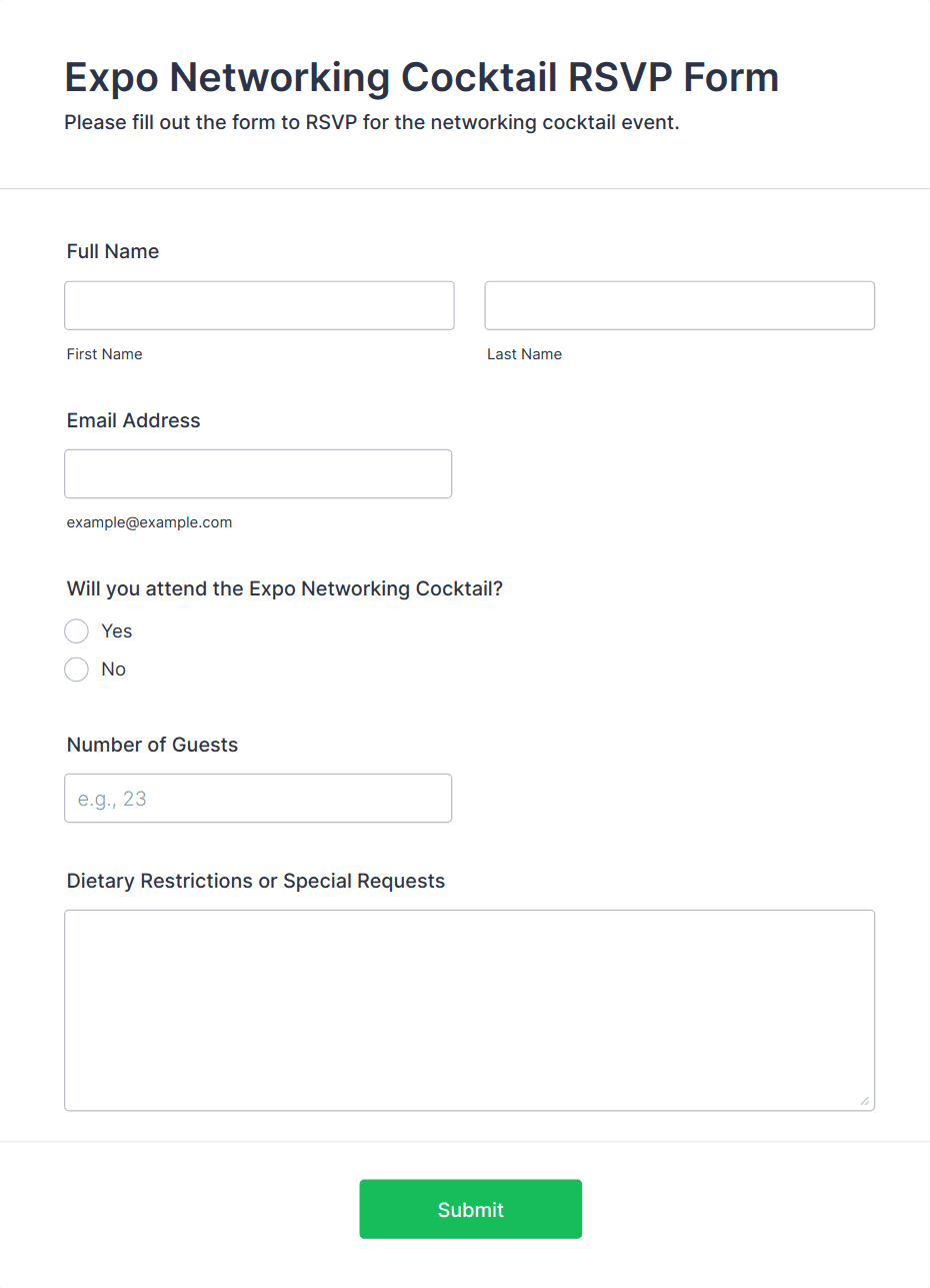 A cocktail event RSVP is a form used to collect information from event attendees and RSVP for a cocktail or networking event.