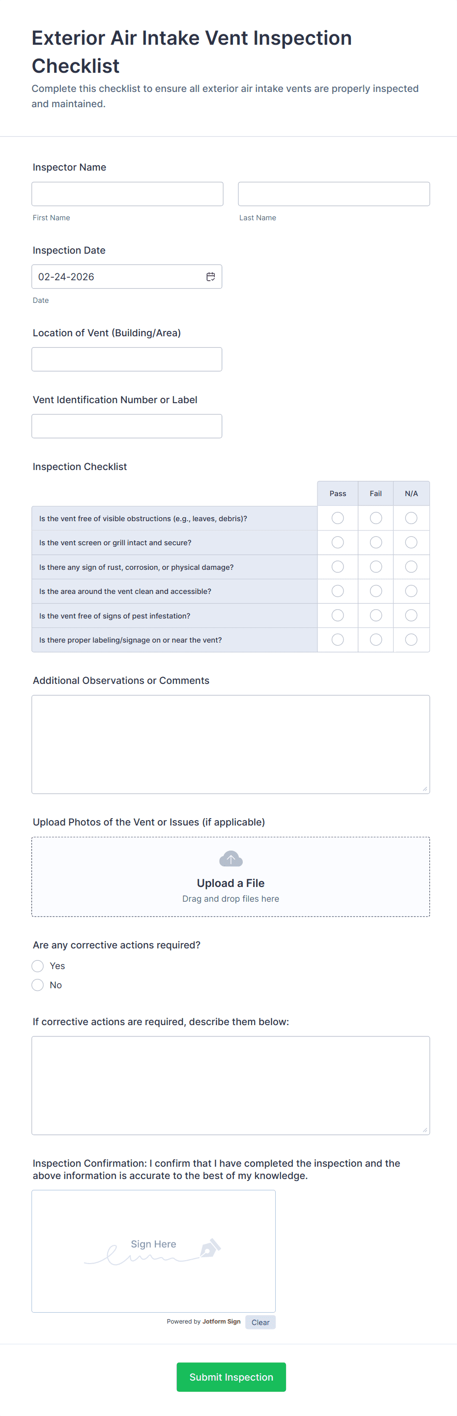 An inspection form is a structured document used to assess, record, and report the condition, compliance, or quality of assets, environments, or processes during an inspection.