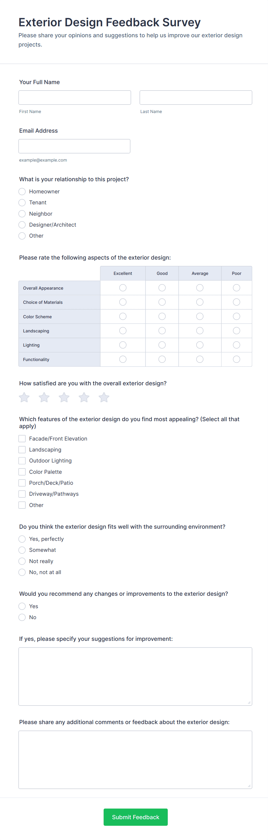 • For customer feedback, include questions about satisfaction, product quality, and likelihood to recommend.