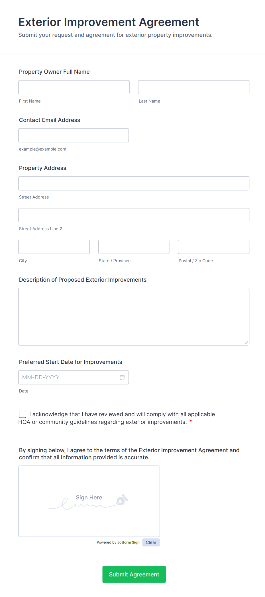 HOA Forms templates in Jotform are ready-to-use digital forms that help homeowners associations collect and manage requests like architectural approvals, maintenance reporting, amenity reservations, and community feedback.