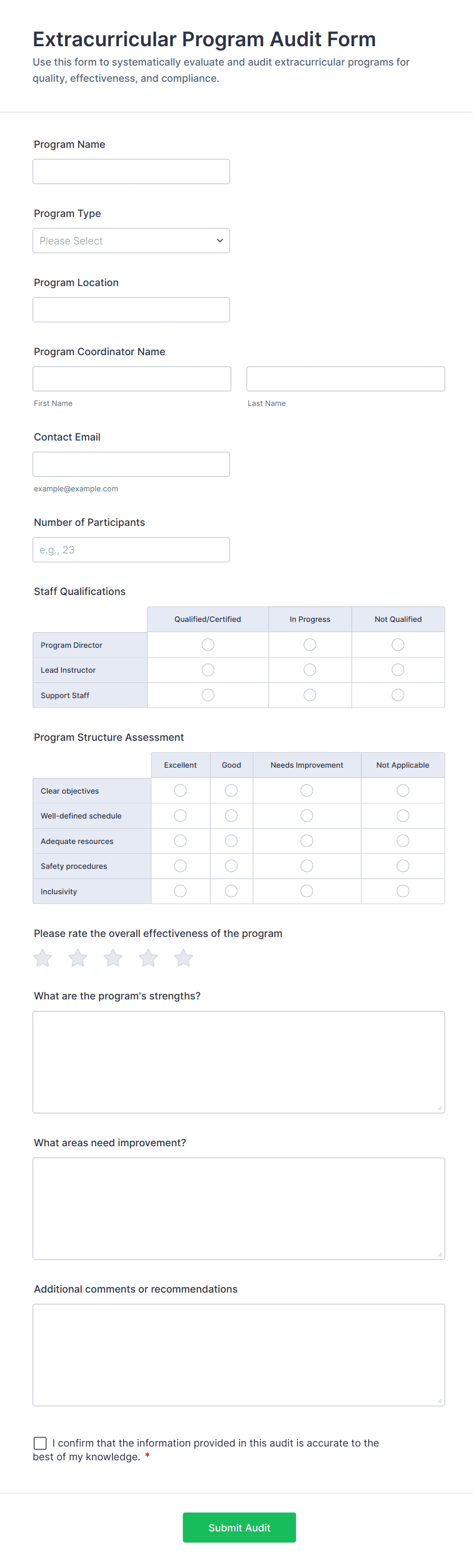Audit forms are used by safety officers, quality managers, compliance teams, auditors, facility managers, HR professionals, and other stakeholders responsible for oversight and evaluation.