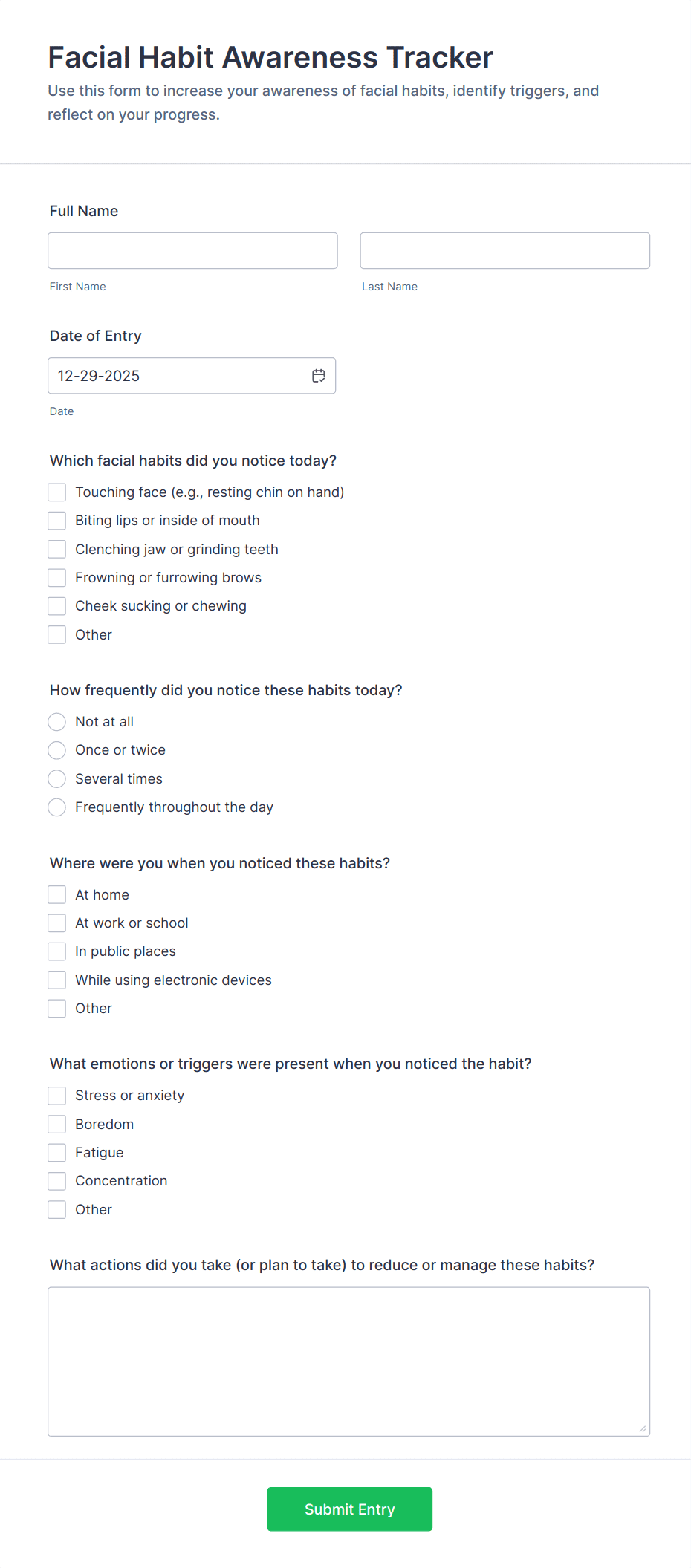 Habit Tracking Forms are digital tools designed to help individuals and organizations monitor, record, and analyze daily routines, behaviors, or lifestyle changes. These forms are commonly used to track habits such as exercise, hydration, reading, medication adherence, sleep patterns, or any other activity that someone wants to develop or maintain over time. By providing a structured way to log progress, Habit Tracking Forms support users in building consistency, identifying patterns, and achieving personal or group goals. They are valuable for personal development, wellness programs, educational settings, coaching, and even workplace productivity initiatives.