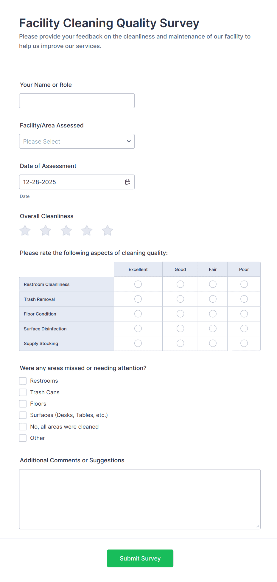 - Short and long text fields for open-ended feedback.