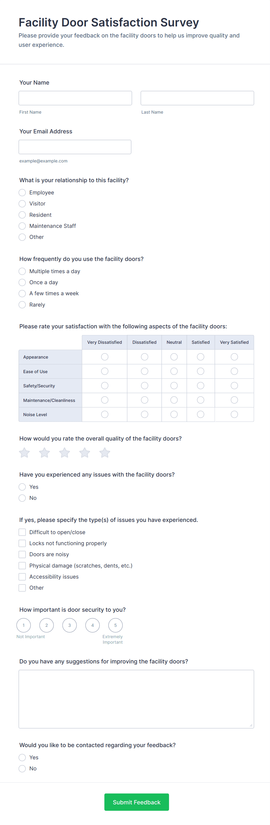 Facility management forms are structured documents used to manage and document facility operations such as maintenance, inspections, space requests, and service coordination. They help organizations collect consistent information about building issues, work orders, safety checks, vendor visits, and operational needs so facilities can run smoothly and safely. Facility management forms are commonly used in offices, campuses, hospitals, hotels, retail locations, warehouses, and industrial sites. Typical workflows include maintenance requests, preventive inspection checklists, cleaning schedules, access requests, and incident reporting. By standardizing these processes, facility management forms reduce delays, improve accountability, and create clear records for follow-up and compliance.