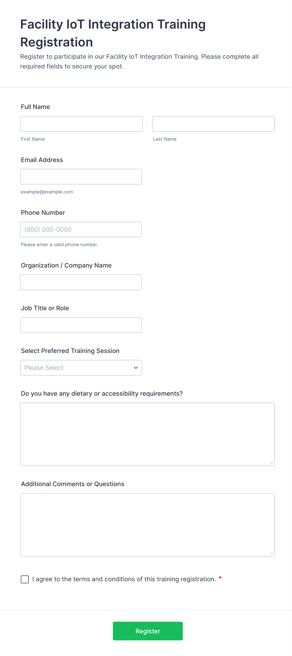 A Training Registration Form is a user-friendly form template designed to streamline the registration process for training providers, corporate HR teams, nonprofits, and event management teams.