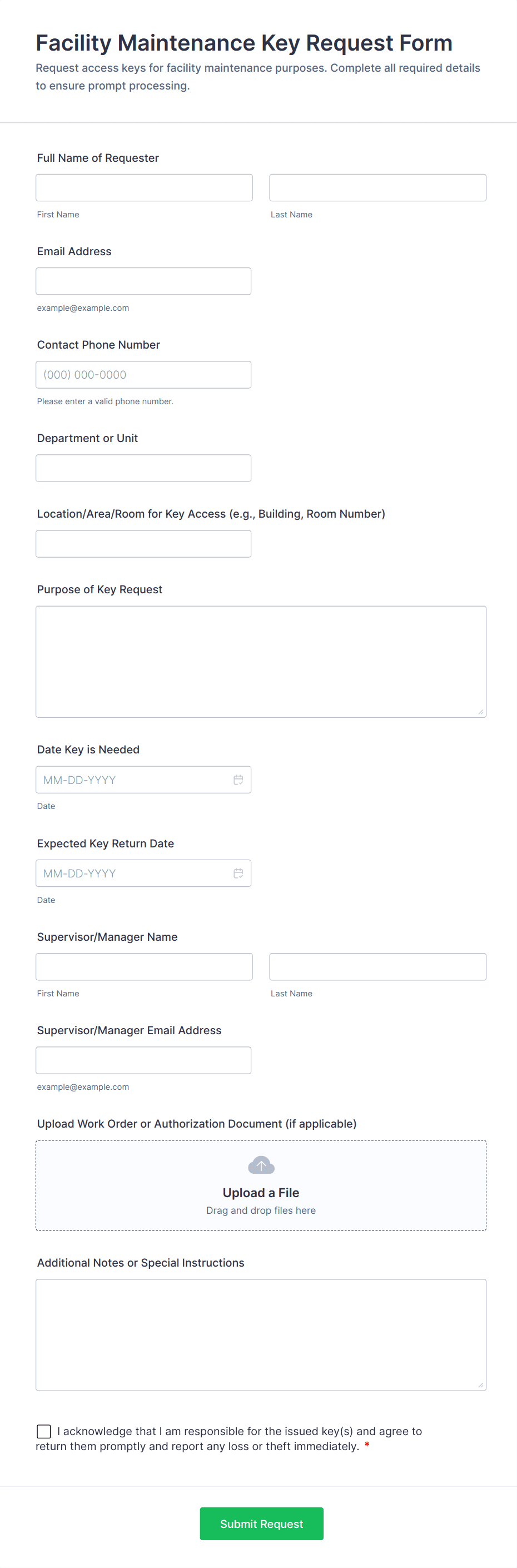 Access control forms are structured documents used to request, approve, and document access to physical locations, systems, or restricted resources. They help organizations manage who can enter certain areas, use specific equipment, or access sensitive digital systems by collecting consistent details such as requester identity, access level, justification, and approval records. Access control forms are commonly used in offices, campuses, data centers, hospitals, warehouses, and IT environments for badge requests, visitor access, temporary passes, role-based system access, and permission changes. By standardizing access requests, these forms reduce security risks, improve accountability, and create clear audit trails.