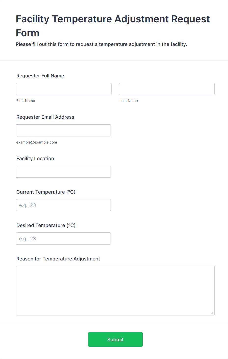 The Facility Temperature Adjustment Request Form allows employees to submit requests for temperature changes in a facility, streamlining the process for facility managers and HR departments.