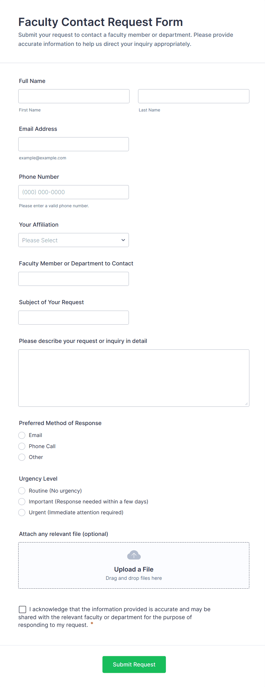 • For specialized use cases, include dropdowns (e.g., inquiry type), checkboxes (e.g., preferred contact method), or file upload fields (for attachments or screenshots).