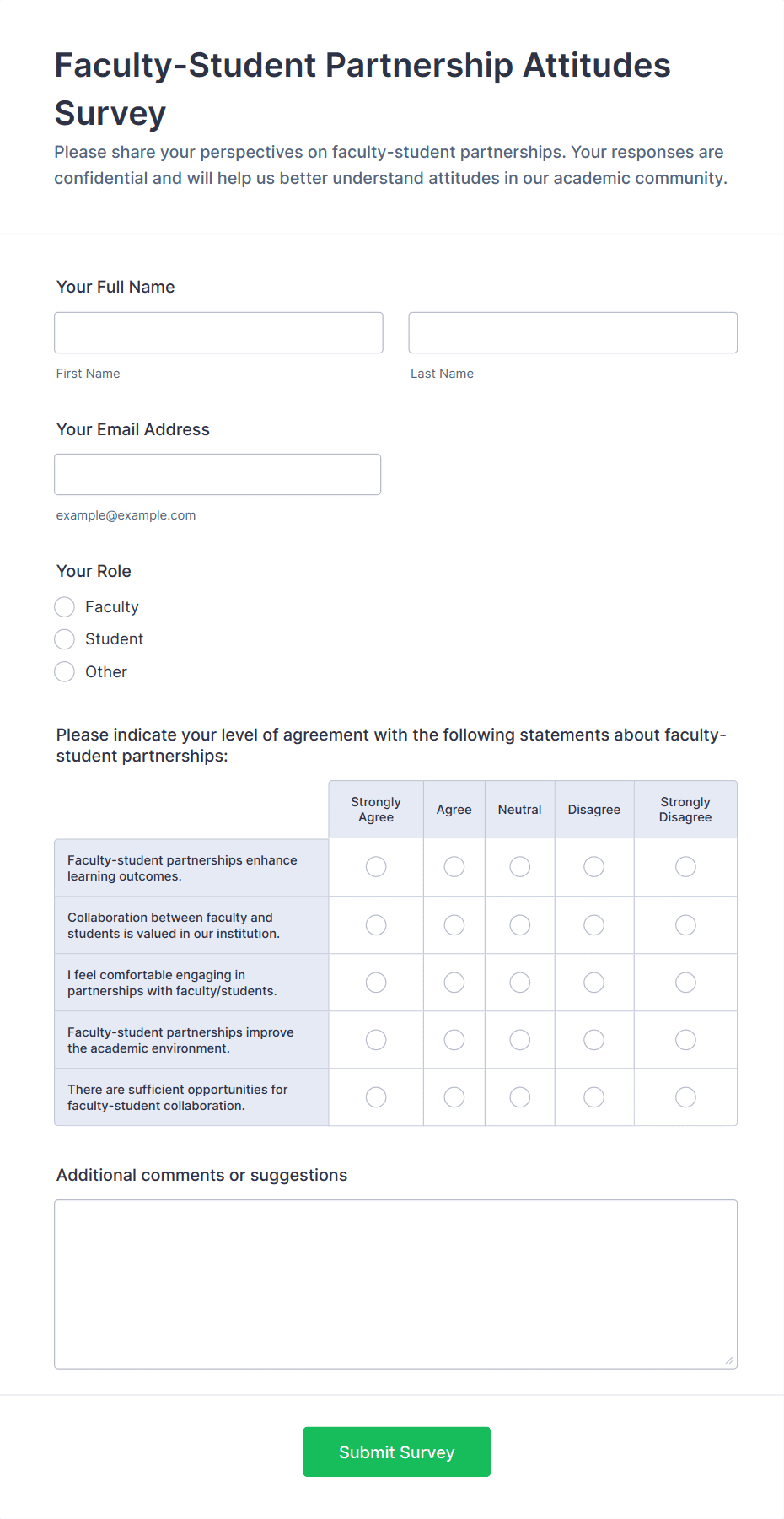 • For teacher or staff surveys: Include self-assessment fields, peer review sections, and narrative response options.