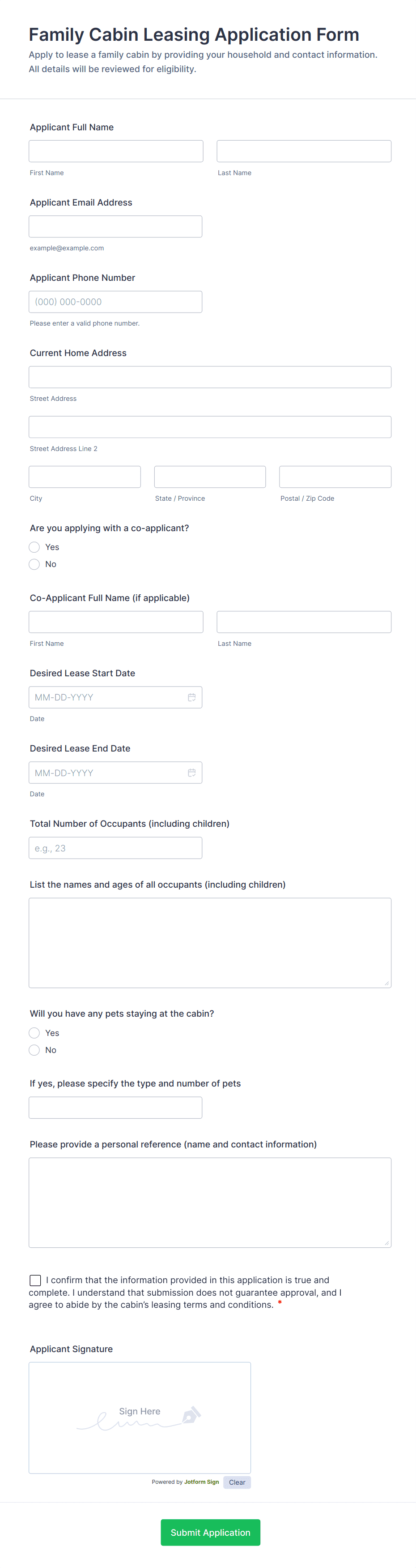 With Jotform, users can easily customize and deploy Rental Application Form Templates to fit their unique requirements. Leveraging Jotform’s intuitive drag-and-drop Form Builder, users can add or modify fields, integrate payment gateways for application fees, and set up conditional logic to tailor the form experience. Submissions are automatically organized in Jotform Tables, making it simple to review, filter, and manage applications. Whether you’re a landlord handling a single property or a property management company overseeing multiple units, Jotform’s no-code platform empowers you to create professional, branded rental application forms in minutes—streamlining your workflow and improving applicant experience.