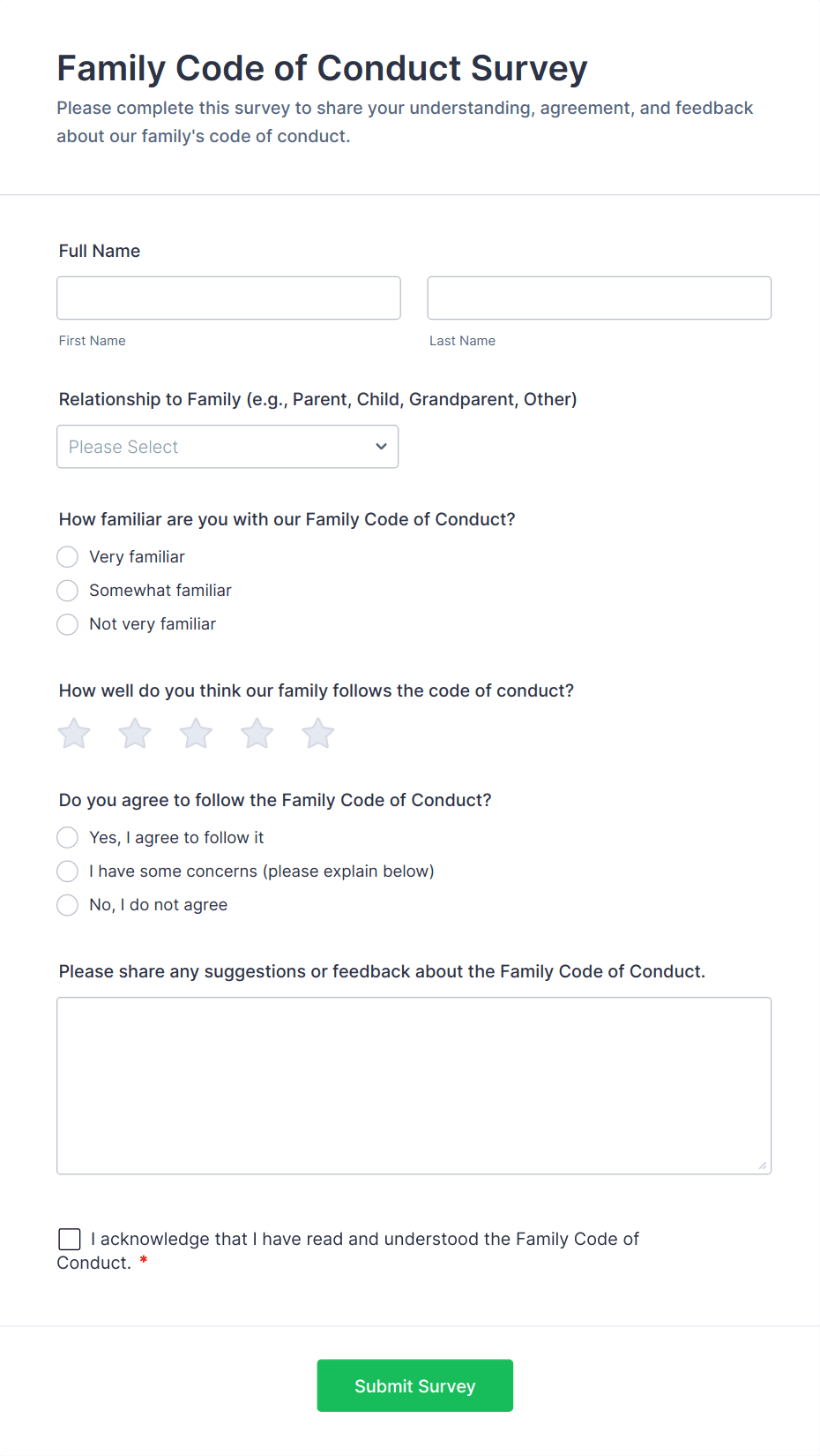 Survey templates are pre-designed forms that help individuals and organizations collect feedback, opinions, or data from a target audience. These templates are widely used for a variety of purposes, such as customer satisfaction surveys, employee engagement assessments, market research, event feedback, and academic studies. By providing a structured set of questions, survey templates streamline the process of gathering valuable insights, making it easier to analyze trends, measure satisfaction, and make informed decisions. Whether you’re a business owner, HR professional, educator, or researcher, survey templates offer a quick and effective way to reach your audience and collect actionable information.