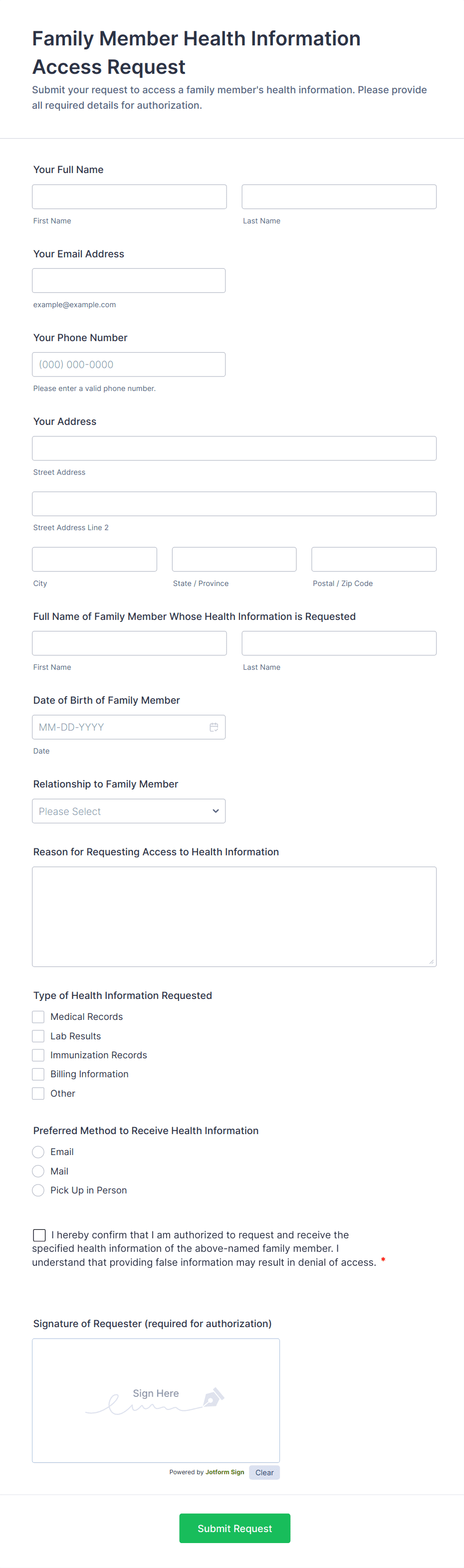 The form templates here are for informational purposes only. Jotform is not providing legal, financial, or other advice, or implying that the forms are legally valid in all or any jurisdictions. Before using any such form, consult an attorney and/or other applicable professionals to make sure that the form meets your needs, legally and otherwise.