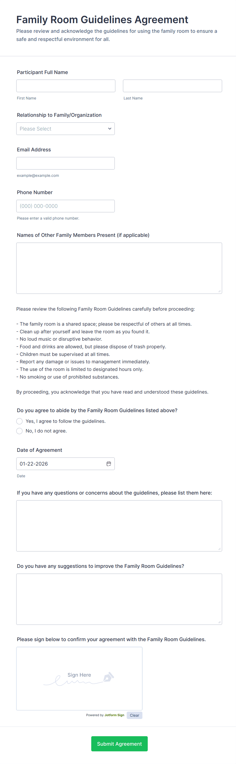 Family Room Guidelines Agreement Form Template for collecting acknowledgments from visitors using shared family spaces, including schools, care centers, and community organizations, with organized Jotform data collection and form submission tracking.