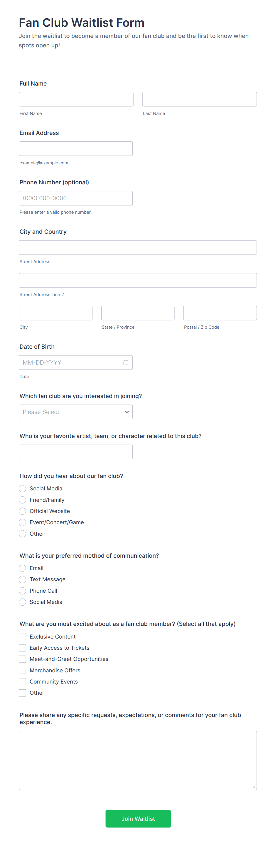 • Newsletter Sign Up: Typically requires only name and email, with optional interest checkboxes.