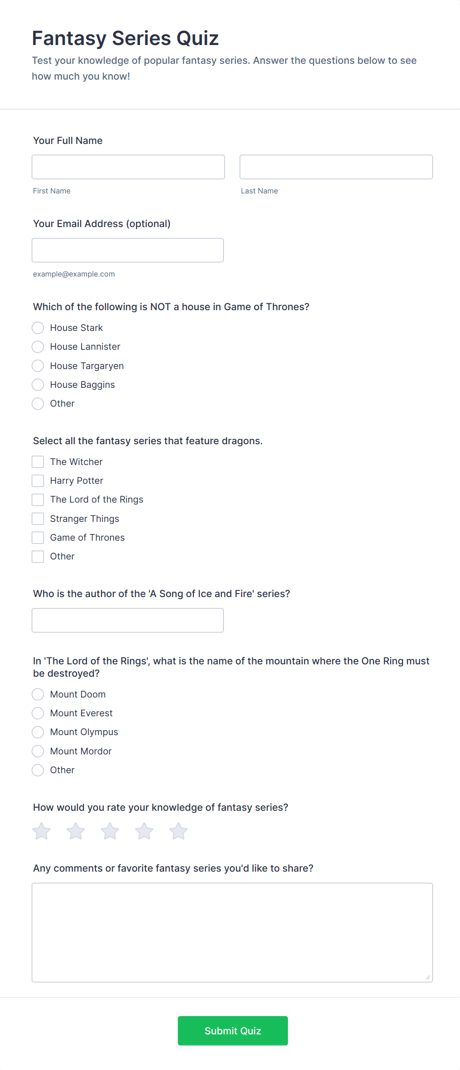 Quiz Templates are pre-designed forms specifically created to facilitate the process of building quizzes for a variety of purposes, such as education, employee training, lead generation, event engagement, and more. These templates provide a structured way to present questions, collect answers, and automatically score or evaluate responses. Whether you’re a teacher assessing student knowledge, a business running a product knowledge test, or a marketer creating a fun personality quiz, Quiz Templates offer a flexible foundation to suit your needs. They can be used for online exams, trivia games, onboarding assessments, customer feedback quizzes, and interactive learning modules.