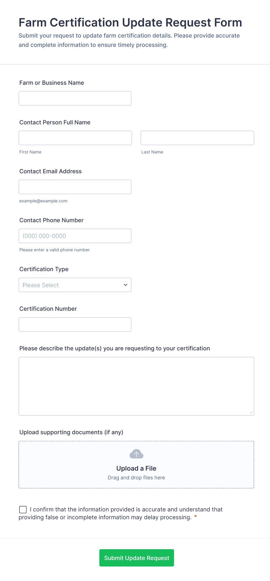 Collect and manage information for your farm with free online Farmer Forms. Whether you’re filling out land lease agreements, selling your products, or collecting worker applications, choose a template below and customize it to perfectly match your needs with our drag-and-drop builder. No coding required! You can then embed your form in your website, share it with a link, or fill it out yourself directly from your smartphone, tablet, or computer. Stop tracking information with pen and paper and upgrade to online Farmer Forms that work great on any device.
