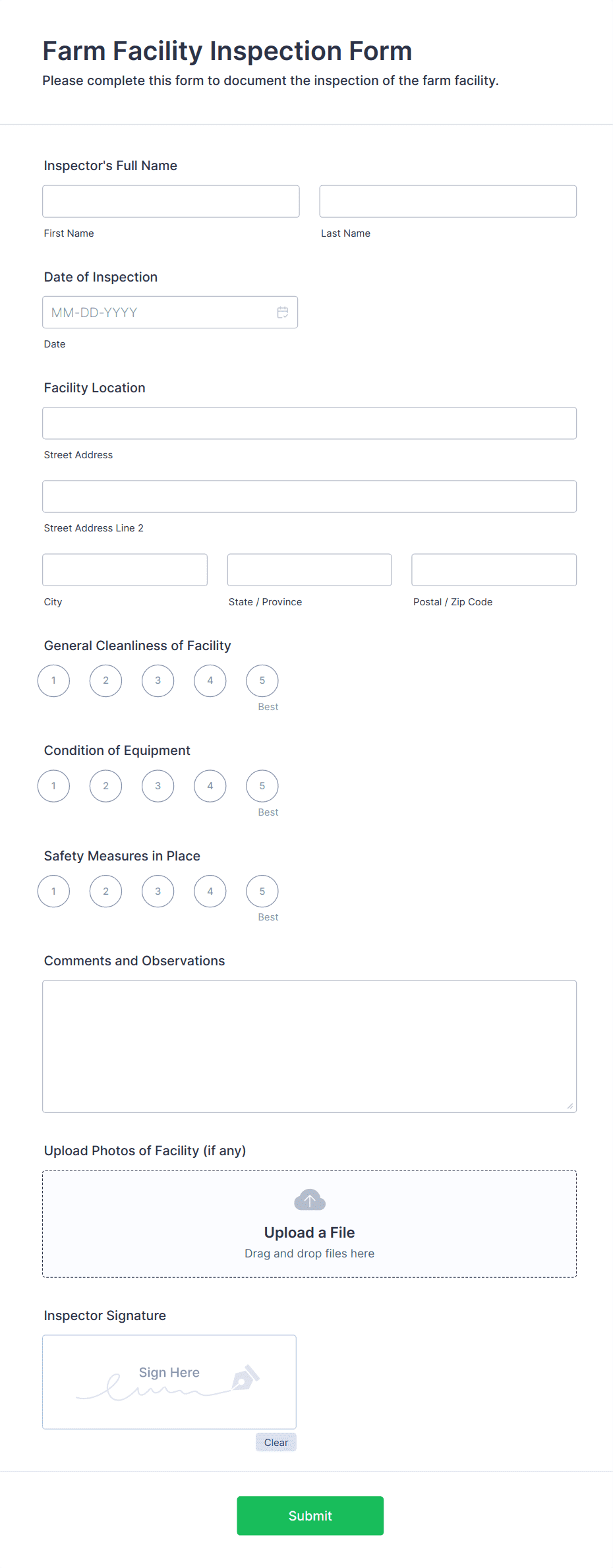 Creating an effective inspection form with Jotform is straightforward and highly customizable, allowing you to address the unique requirements of your inspection process. Whether you’re conducting safety audits, equipment checks, or property walkthroughs, Jotform’s platform ensures your forms are comprehensive, user-friendly, and accessible from any device.