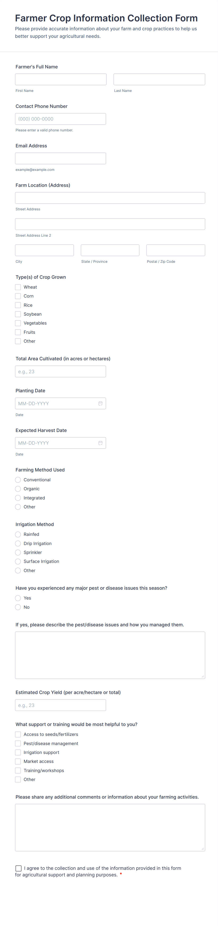 Collect and manage information for your farm with free online Farmer Forms. Whether you’re filling out land lease agreements, selling your products, or collecting worker applications, choose a template below and customize it to perfectly match your needs with our drag-and-drop builder. No coding required! You can then embed your form in your website, share it with a link, or fill it out yourself directly from your smartphone, tablet, or computer. Stop tracking information with pen and paper and upgrade to online Farmer Forms that work great on any device.