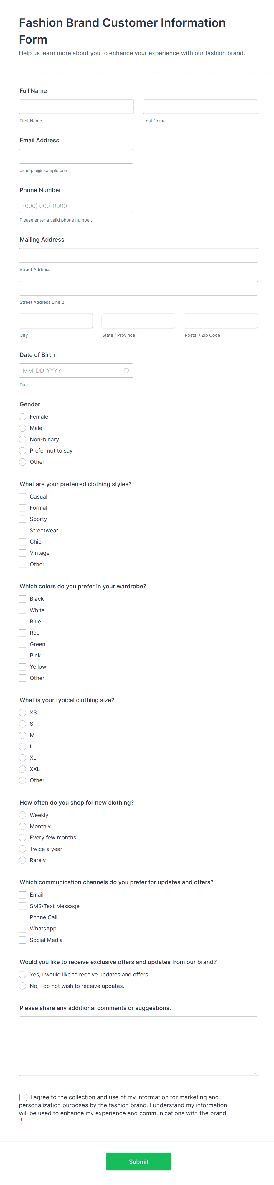 • Loyalty program enrollment: Typically requests contact details and consent for marketing communications.