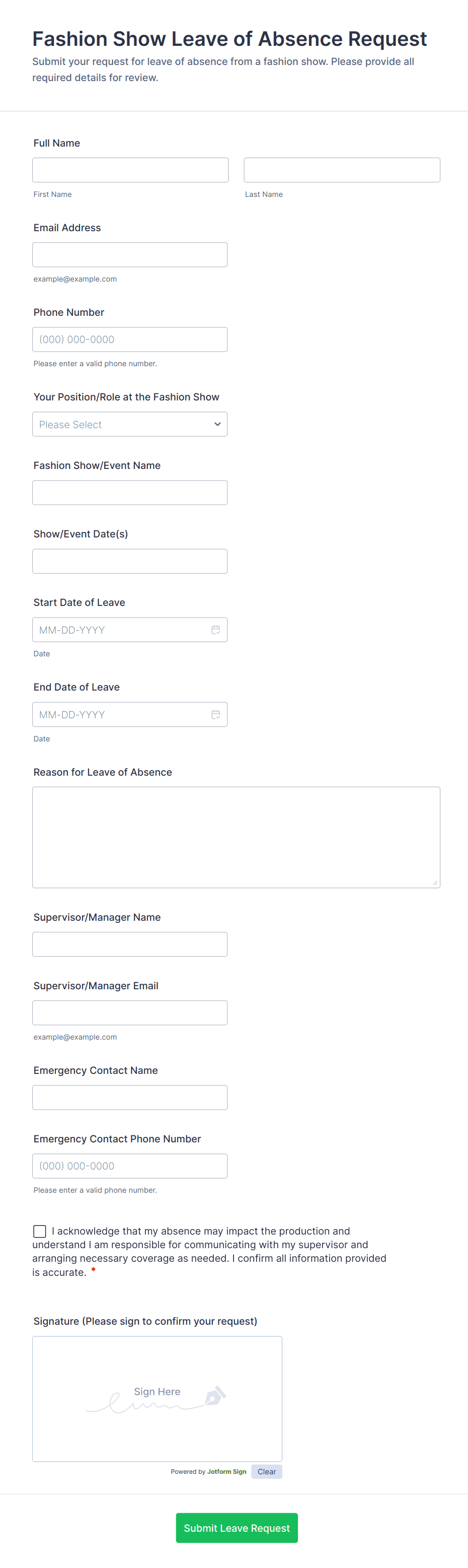 Leave Request Form Templates are digital forms designed to streamline the process of requesting and managing employee absences within organizations. These templates are commonly used by HR departments, team leaders, and managers to collect essential information from employees who need to take time off for reasons such as vacation, sick leave, personal days, parental leave, or other special circumstances. By standardizing the leave request process, these forms help ensure that all necessary details—such as dates, type of leave, reason for absence, and approval status—are captured efficiently and consistently. Use cases range from small businesses tracking vacation days to large enterprises managing complex leave policies across multiple departments.