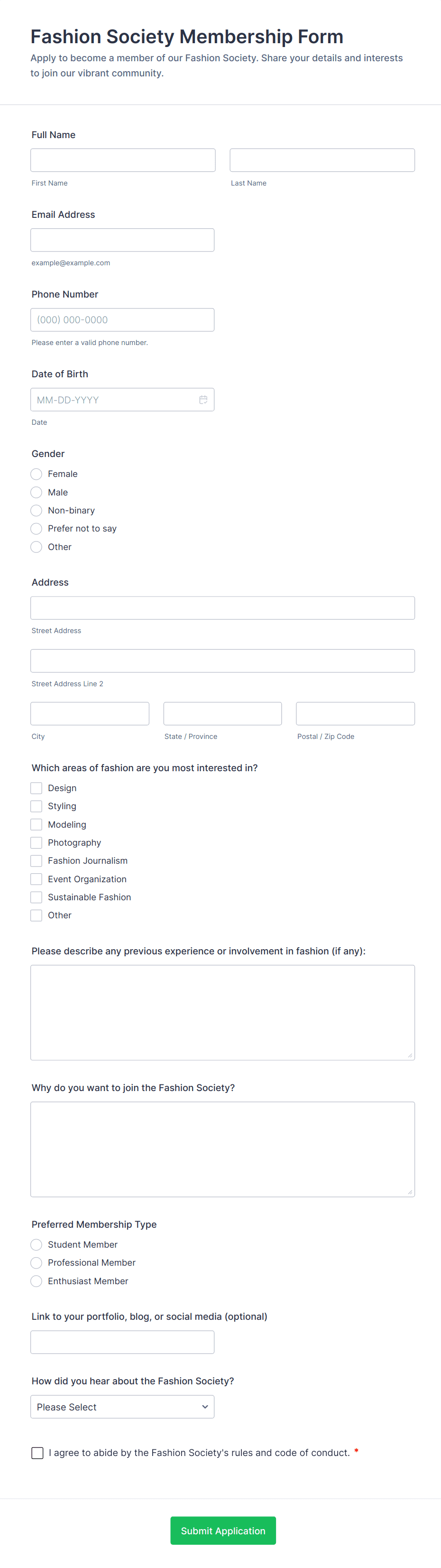 A Community Membership Application Form is a form template designed to streamline the membership application process for community administrators or organizers.