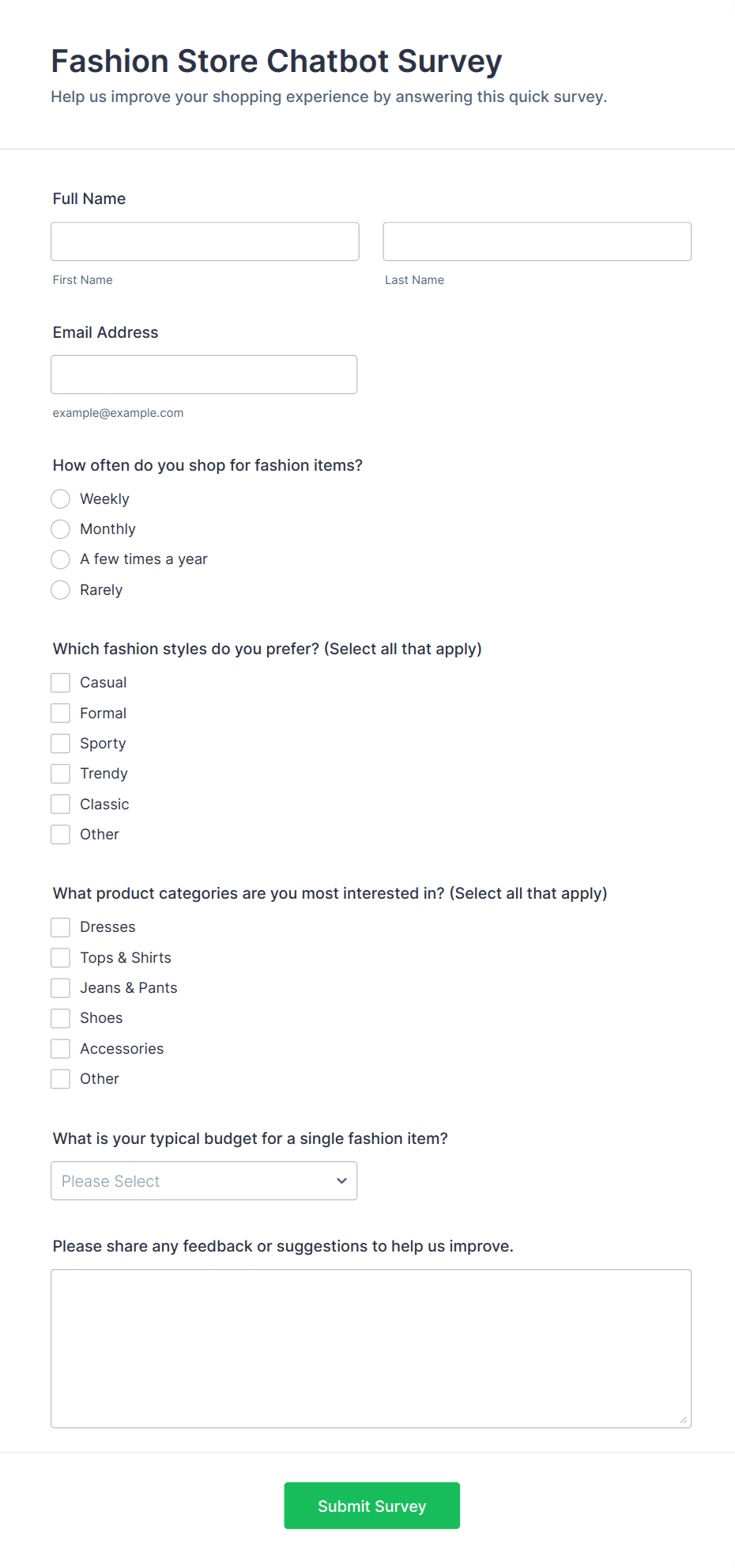 • Short and long text fields for open-ended feedback.