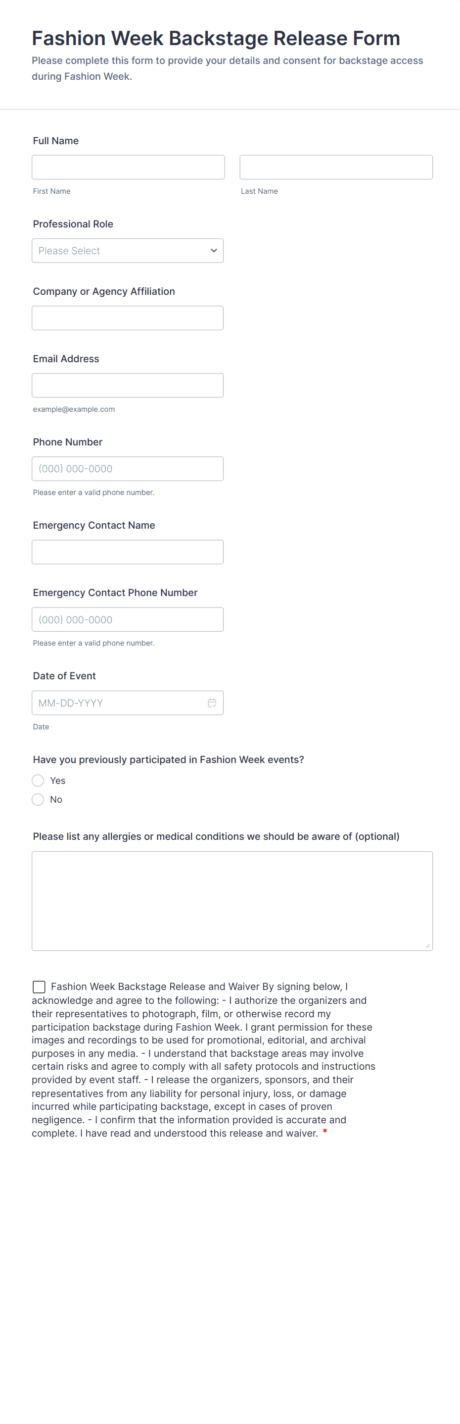 - For specialized releases, include conditional logic to show or hide fields based on user responses (e.g., show parent fields if the participant is under 18).