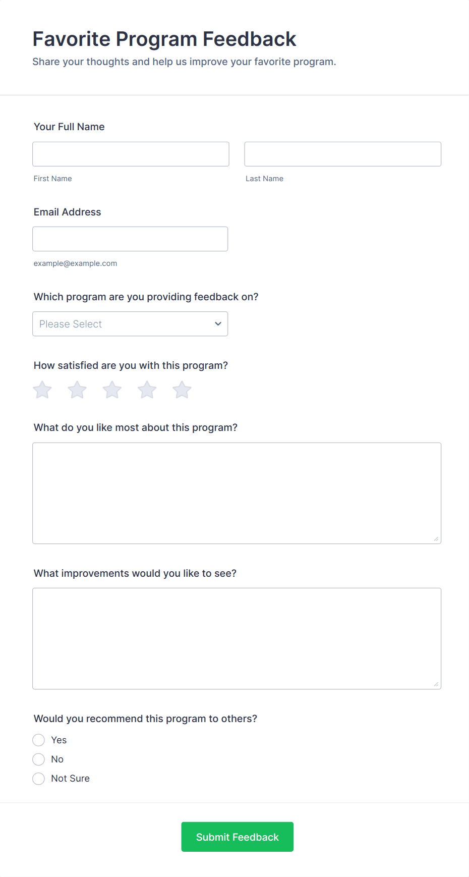 • Product feedback forms may include questions about usability, features, and likelihood to recommend.